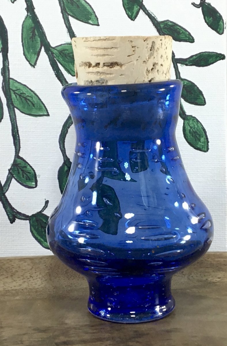 Thick Artistic Glass Canister with cork stopper is a cobalt blue with bubble trapping. Can generally hold about 1/8th of smoking material.
