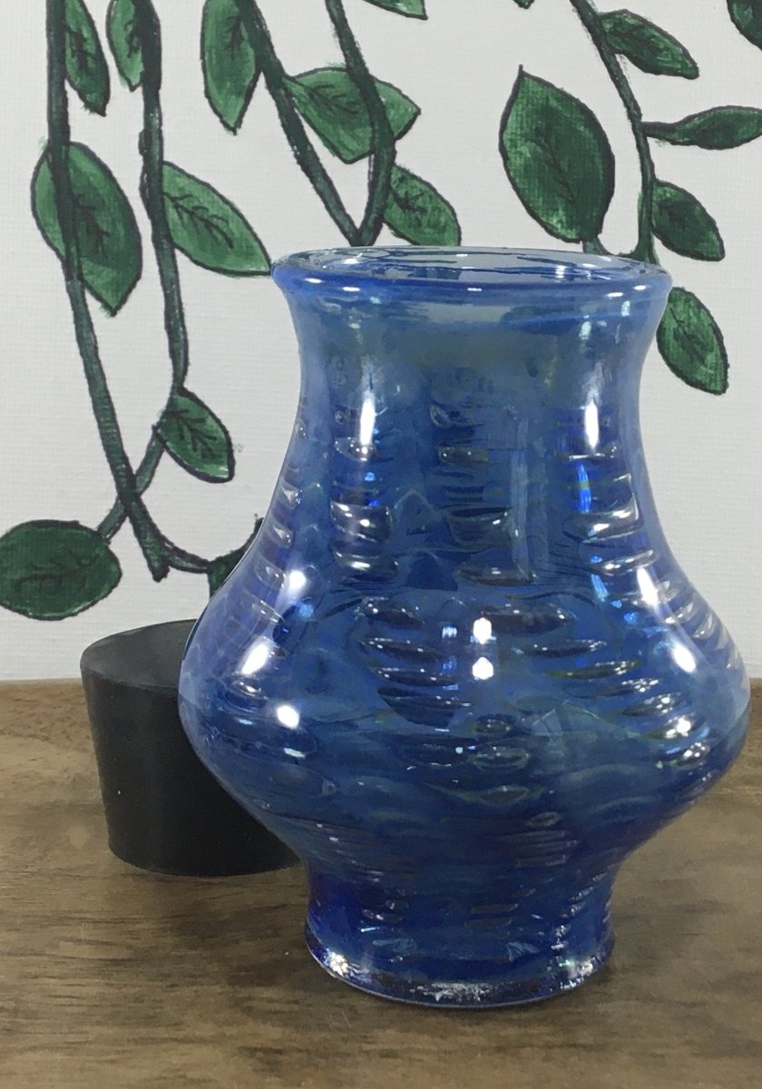 Thick Artistic Glass Canister with rubber stopper is a unique shaped cobalt jar with bubble trapping and fuming. Can generally hold about 1/8th of smoking material.