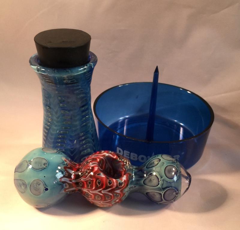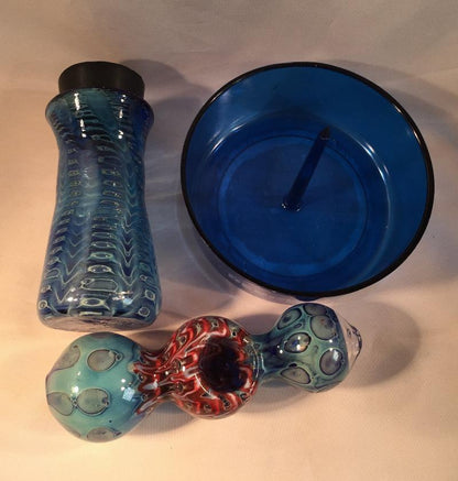 Receive this 3 1/2 " Tall Bubble Trap Container with Black Rubber stopper. Along with a Red, White and Blue Steamroller Handpipe and a Debowler Ashtray for a complete gift pack every stoner would love.
