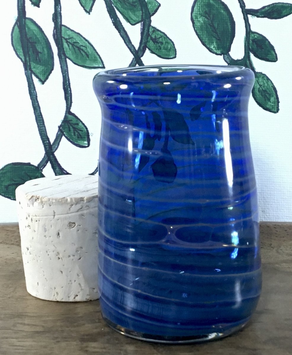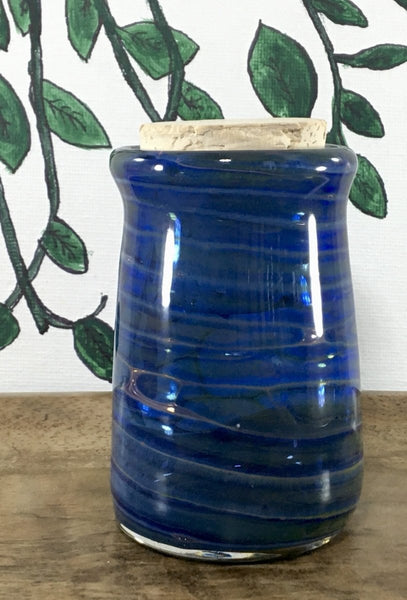 Thick Artistic Glass Canister with cork stopper is a cobalt jar and green rings and light fuming. Can generally hold about 1/8th of smoking material.