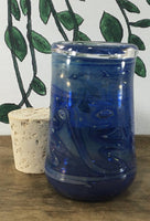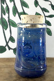 Thick Artistic Glass Canister with cork stopper is a clear jar with cobalt and green swirls and light fuming. Can generally hold about 1/8th of smoking material.