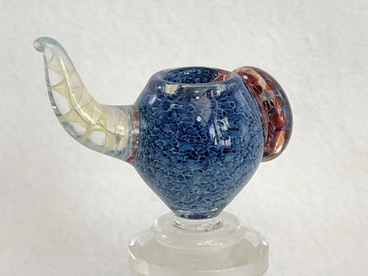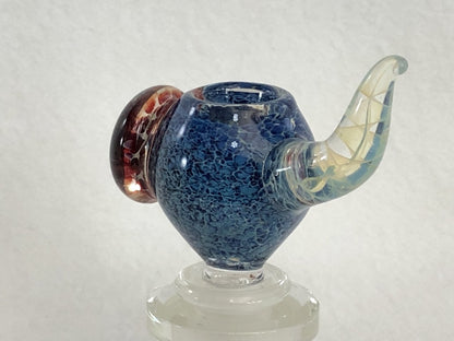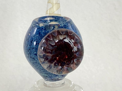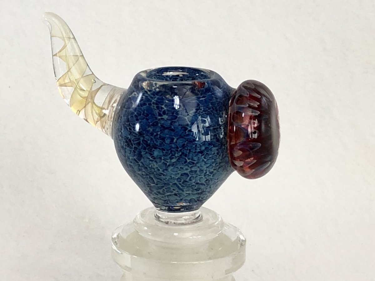 These 14mm slide are sure to make your setup stand out. Has a beautiful blue fritted bowl, red marble flower and a swirl horn. Each piece is hand blown making them uniquely yours