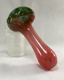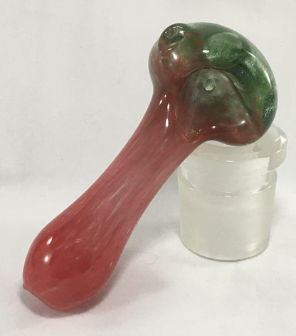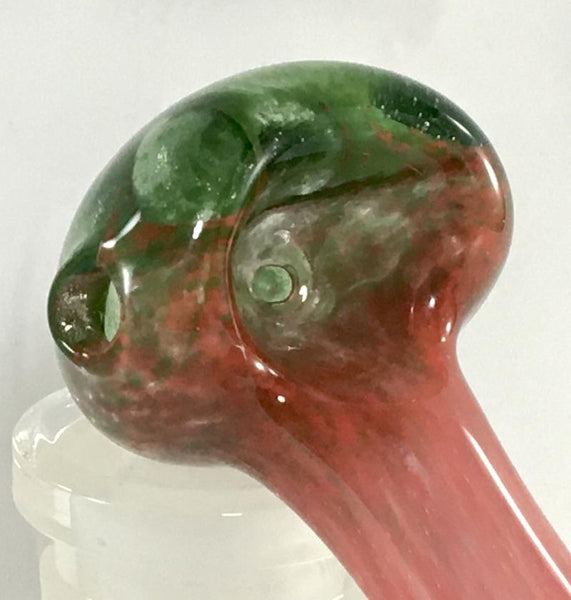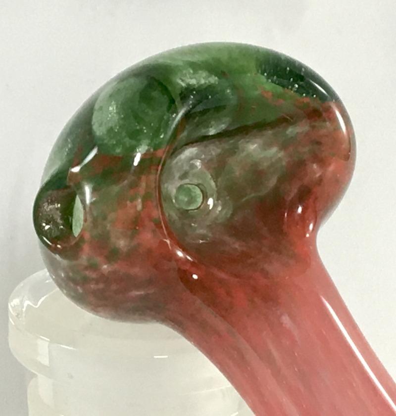The pictures of this beauty tells all. Fritted red shaft simmering into a green smoke bowl. It has a large mouth opening for an extreme hit. Made in the USA by Antonio Casale.