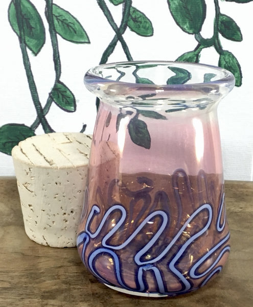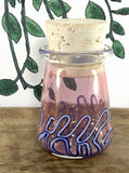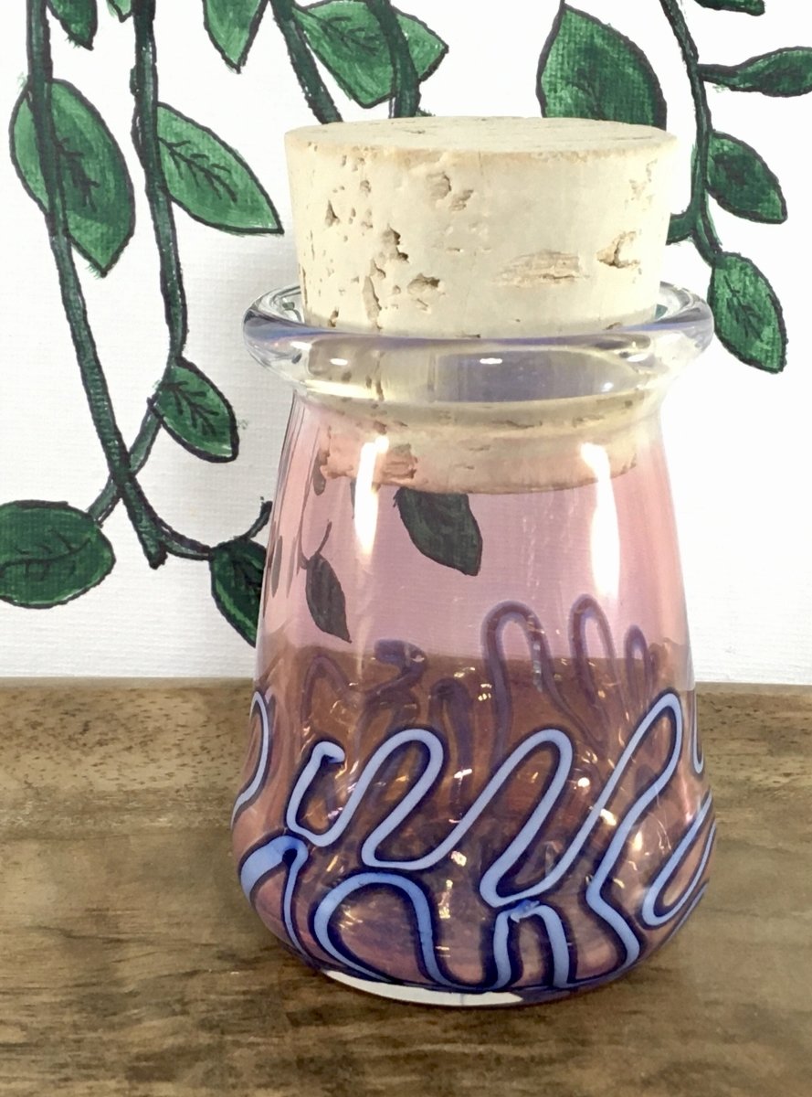 Thick Artistic Glass Canister with cork stopper is a clear jar with blue and white swirling then fumed. Can generally hold about 1/8th of smoking material.