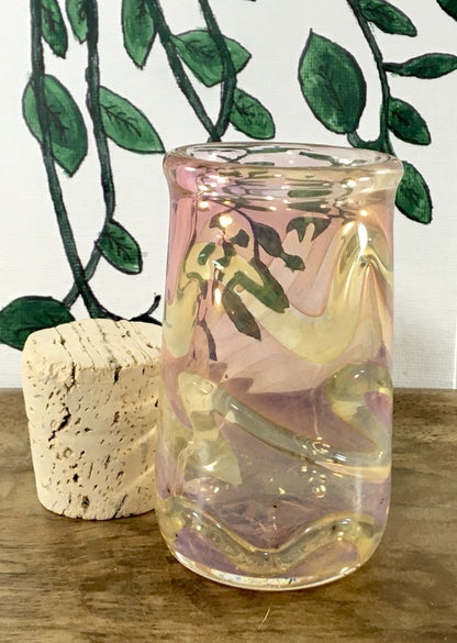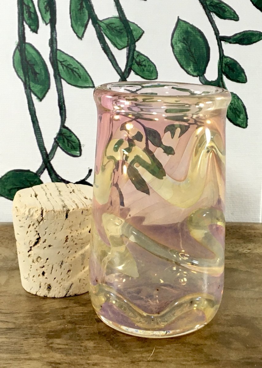 Thick Artistic Glass Canister with cork stopper is a clear glass gold fumed with silver fumed swirls. Can generally hold about 1/8th of smoking material.