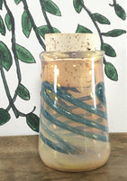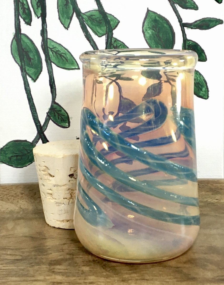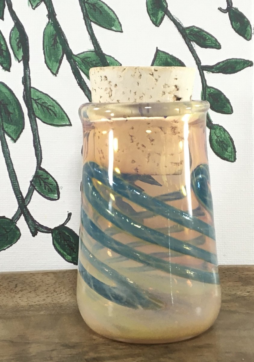Thick Artistic Glass Canister with cork stopper is a clear jar with gold fuming makes a beautiful pink hue. Emerald ribboning added before the fuming gives it a unique color. Can generally hold about 1/8th of smoking material.