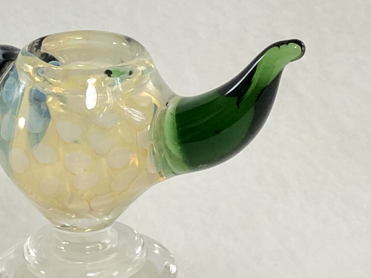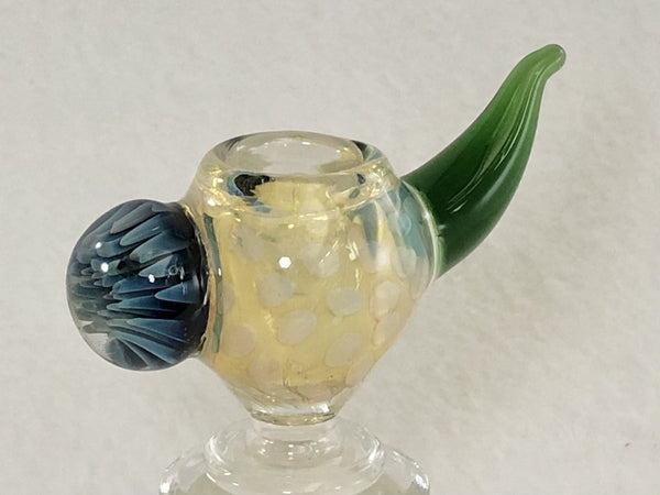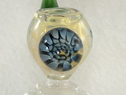 These 14mm slide are sure to make your setup stand out. Slide has a beautiful blue flower marble, lightly spotted bowl and finishes with a vibrant green horn. Each piece is hand blown making them uniquely yours