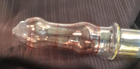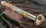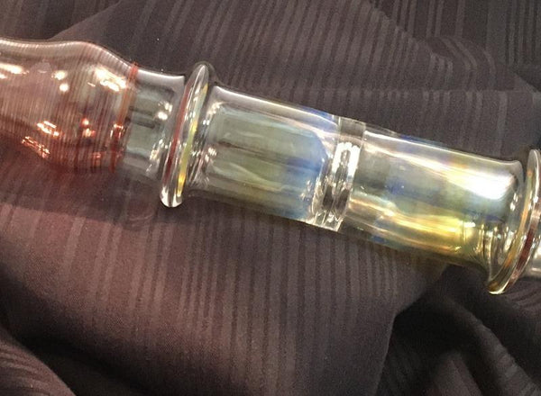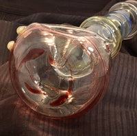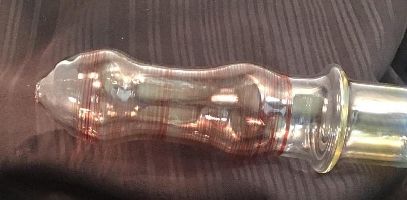 Clear bowl with red striping and opaque marbles. Clear shaft leads to silver fume then more red striping.