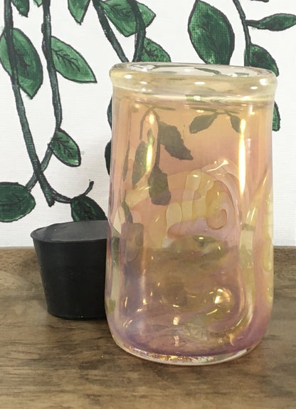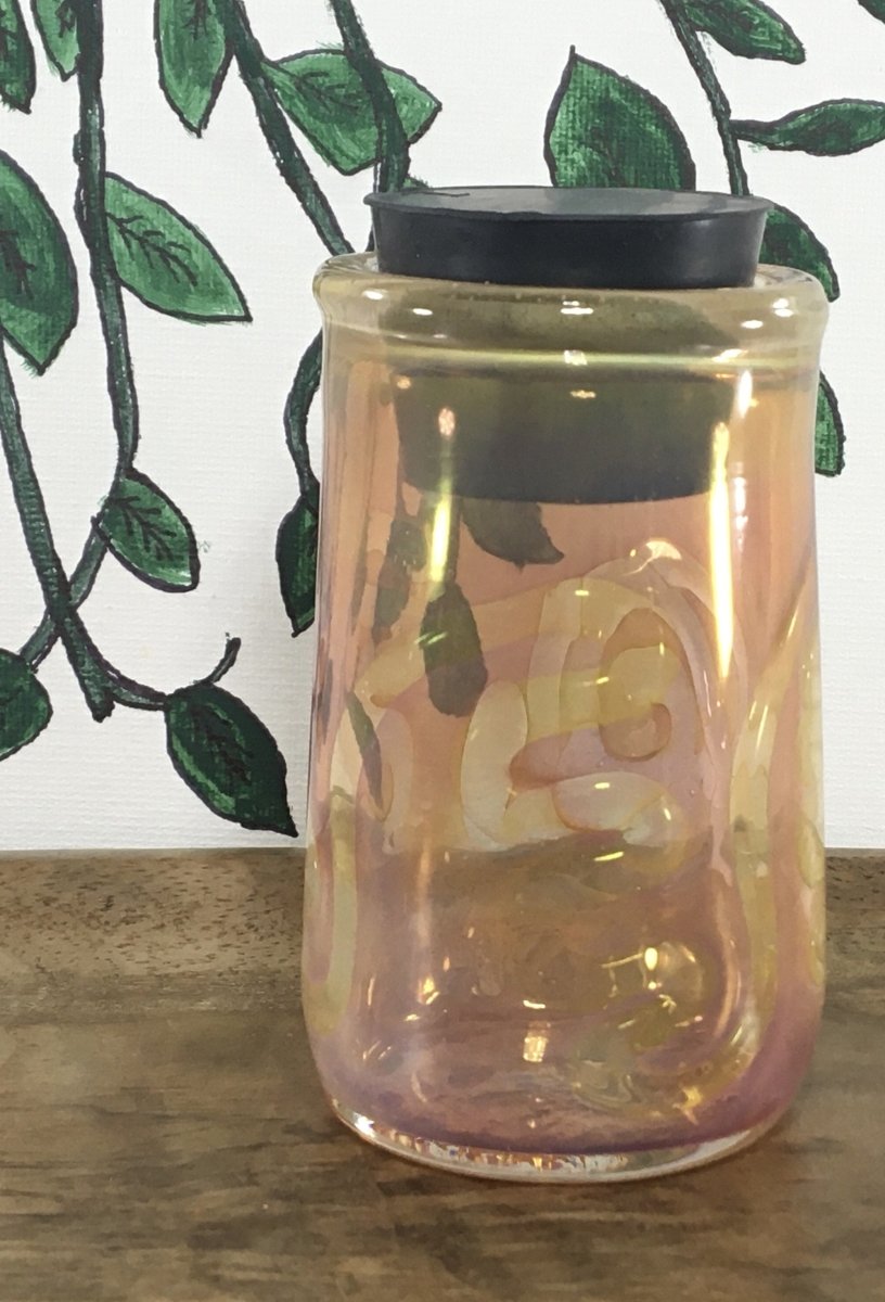Thick Artistic Glass Canister with rubber stopper is a clear glass jar with swirls and fuming making its yellow and pink hues. Can generally hold about 1/8th of smoking material.
